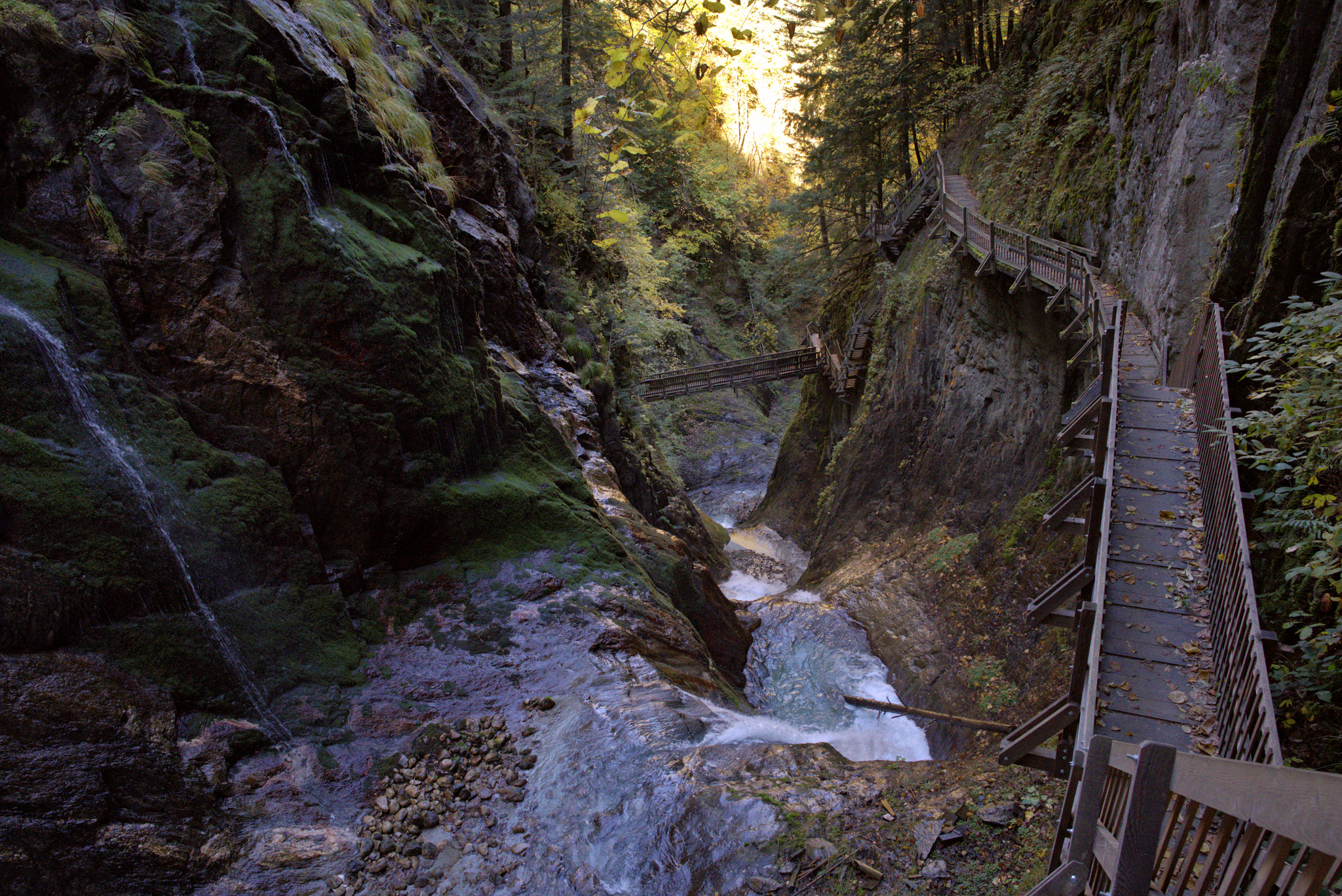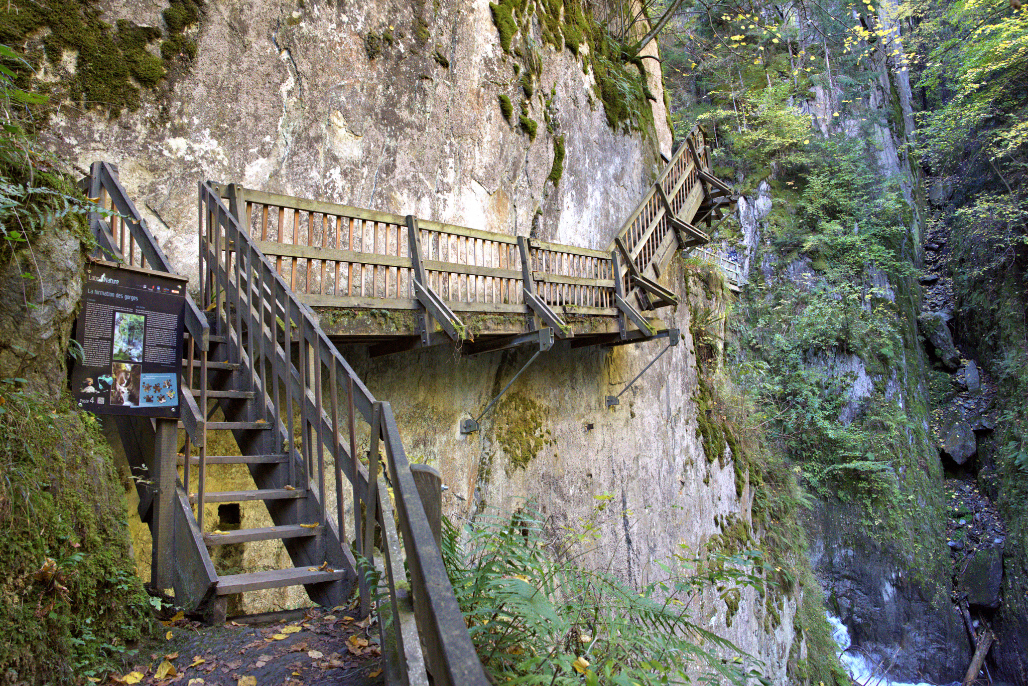 Entrez dans les Gorges du Durnand – und tauche ein in eine wilde, kühle Schluchtenwelt bei Bovernier (nahe Martigny) im Wallis. Die begehbare Schlucht ist etwa 1 km lang und führt über hängende Holzstege, Brücken, kurze Tunnel und Treppen – ein richtiges kleines Abenteuer.