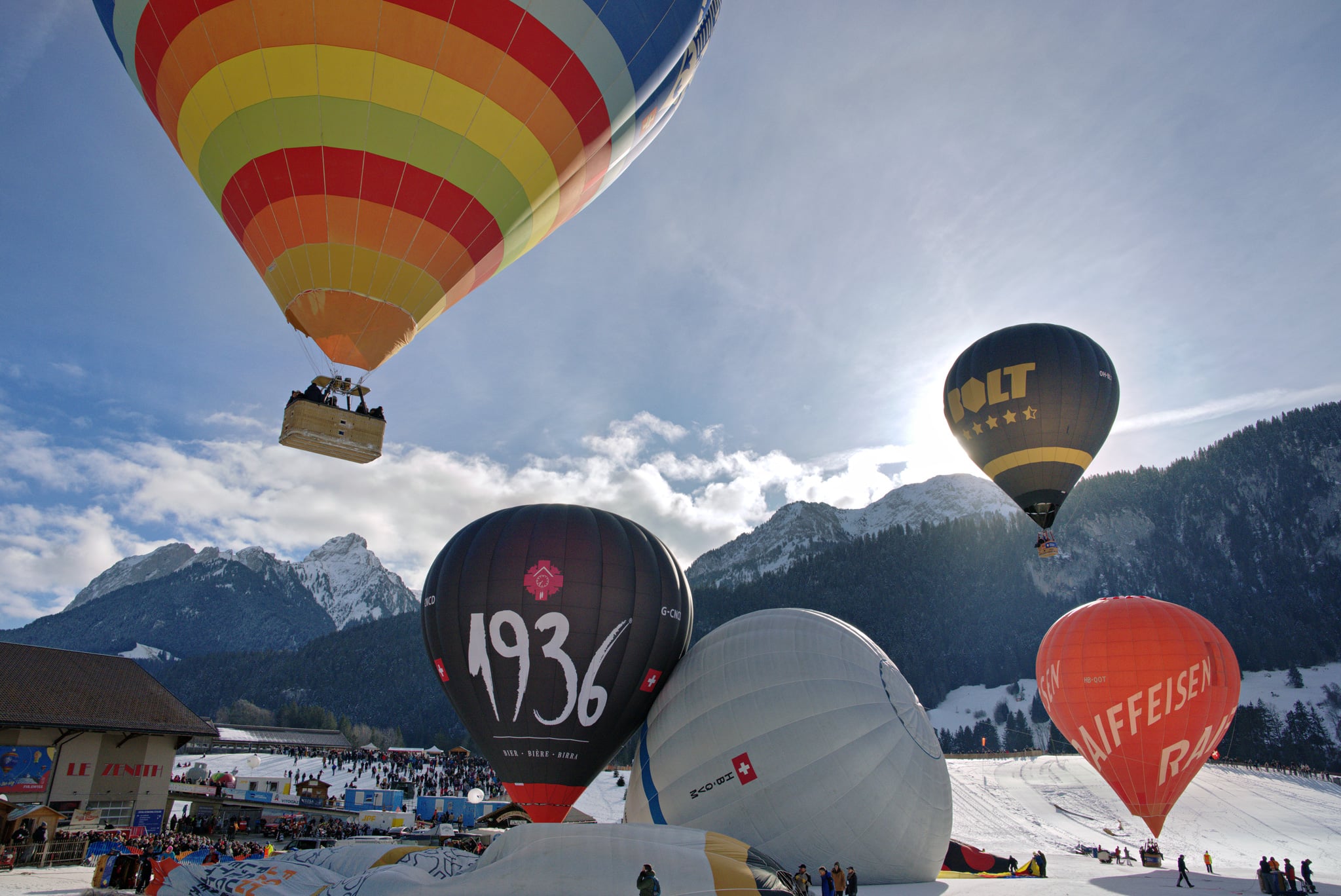Das Festival International de Ballons in Château-d’Oex ist ein farbenfrohes Winterfestival, bei dem Heißluftballons aus aller Welt über einem alpinen Tal starten und den Himmel in ein riesiges Panorama verwandeln. Es dauert 9 Tage und bietet neben den Ballonstarts auch Wettbewerbe, spezielle Ballonformen, Food-Stände sowie ein familienfreundliches Rahmenprogramm.